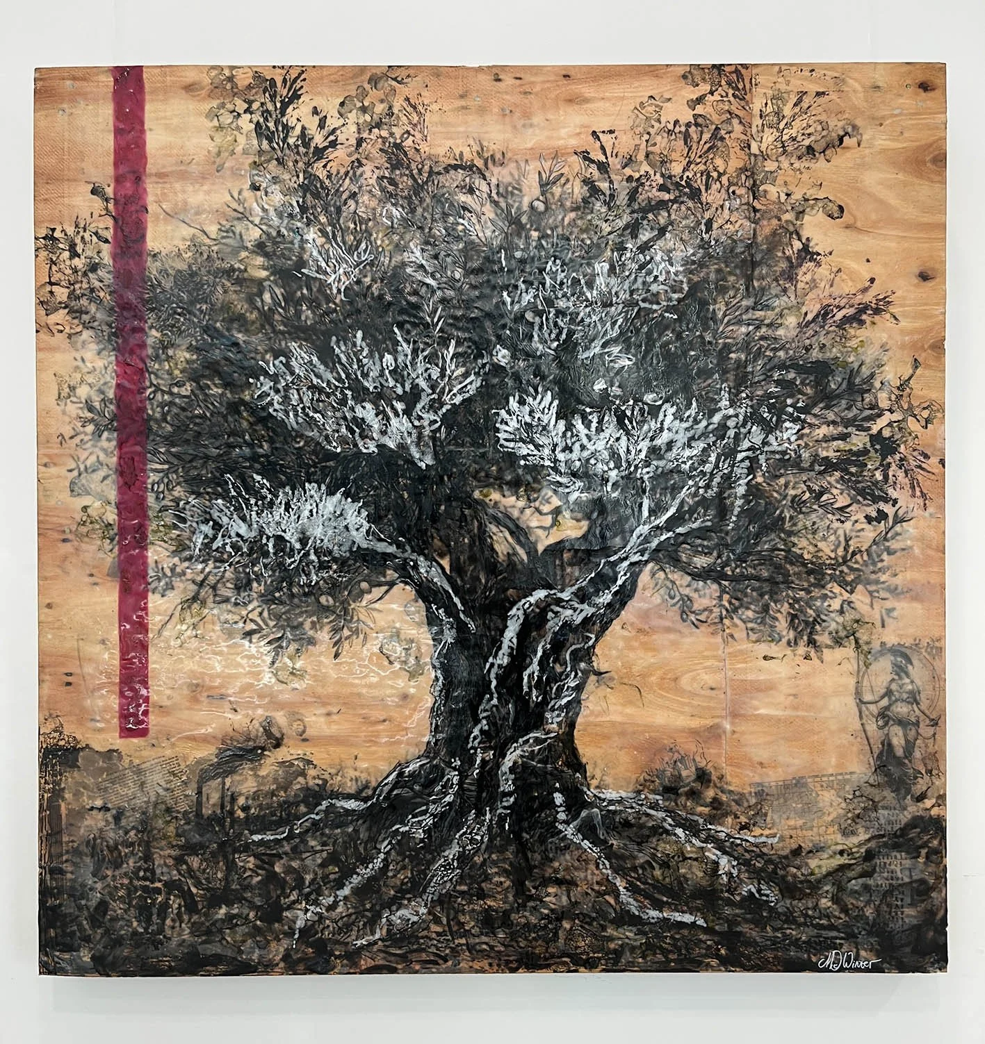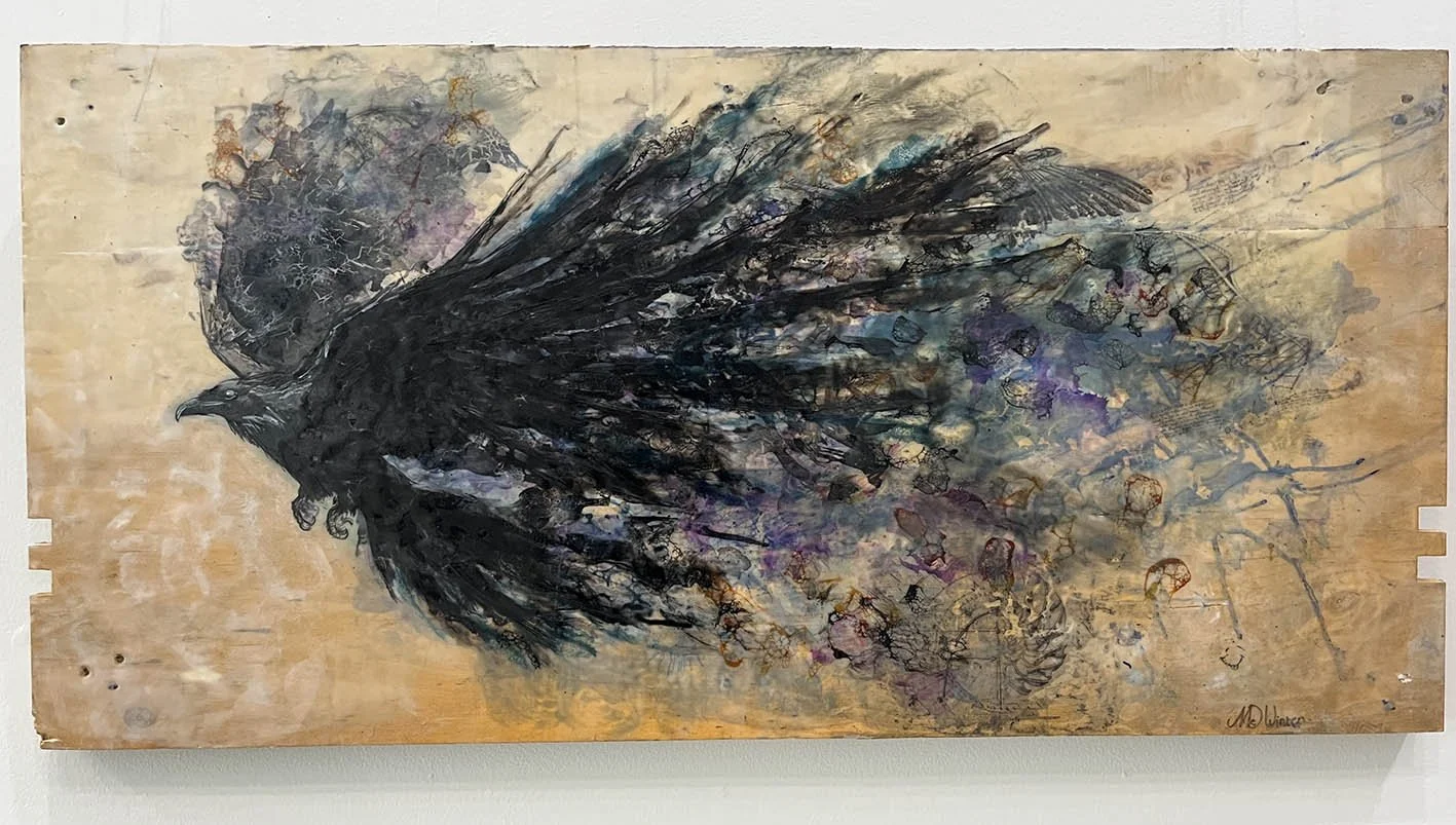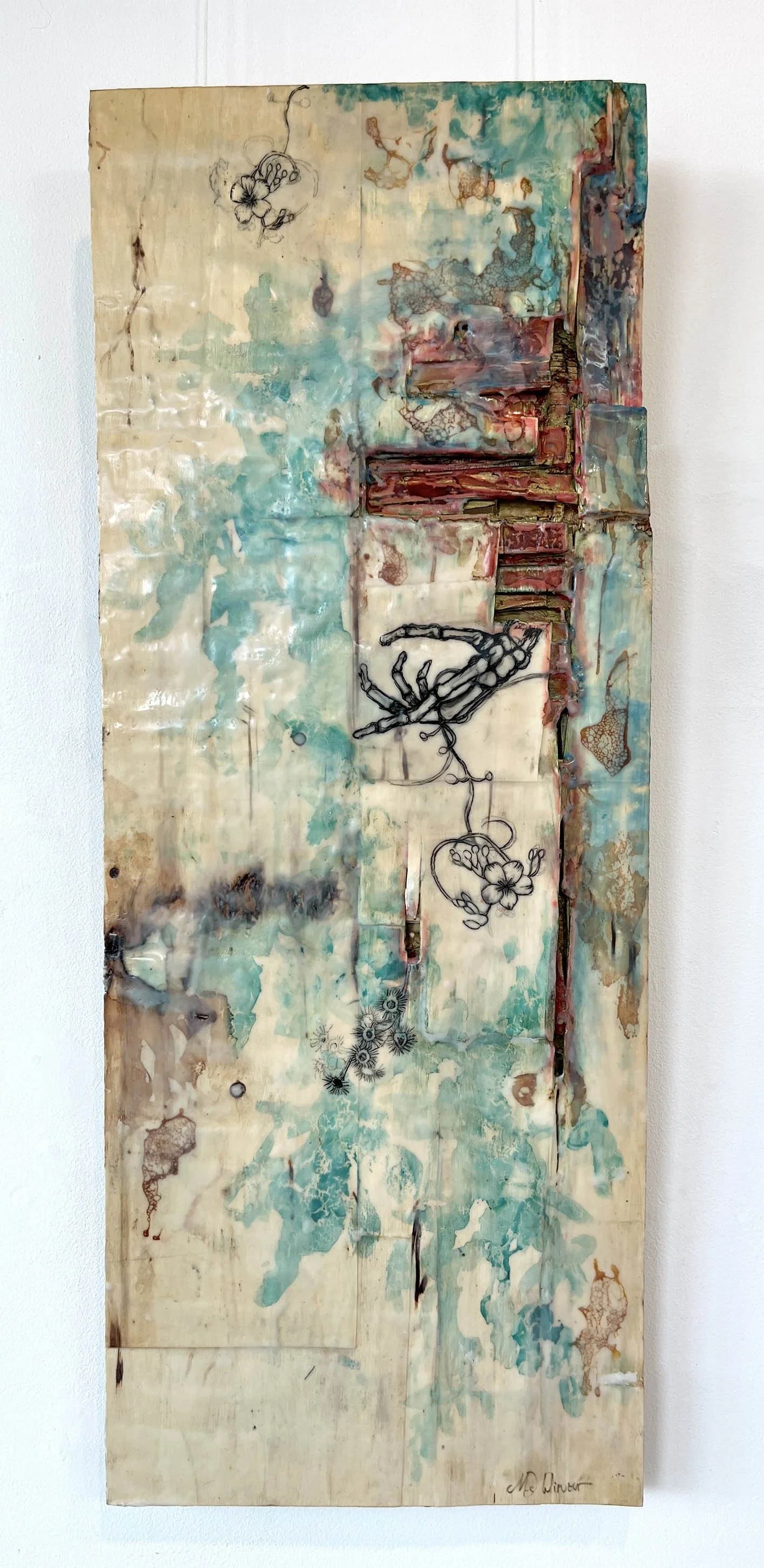 Encaustic and ink on upcycled packing pallet