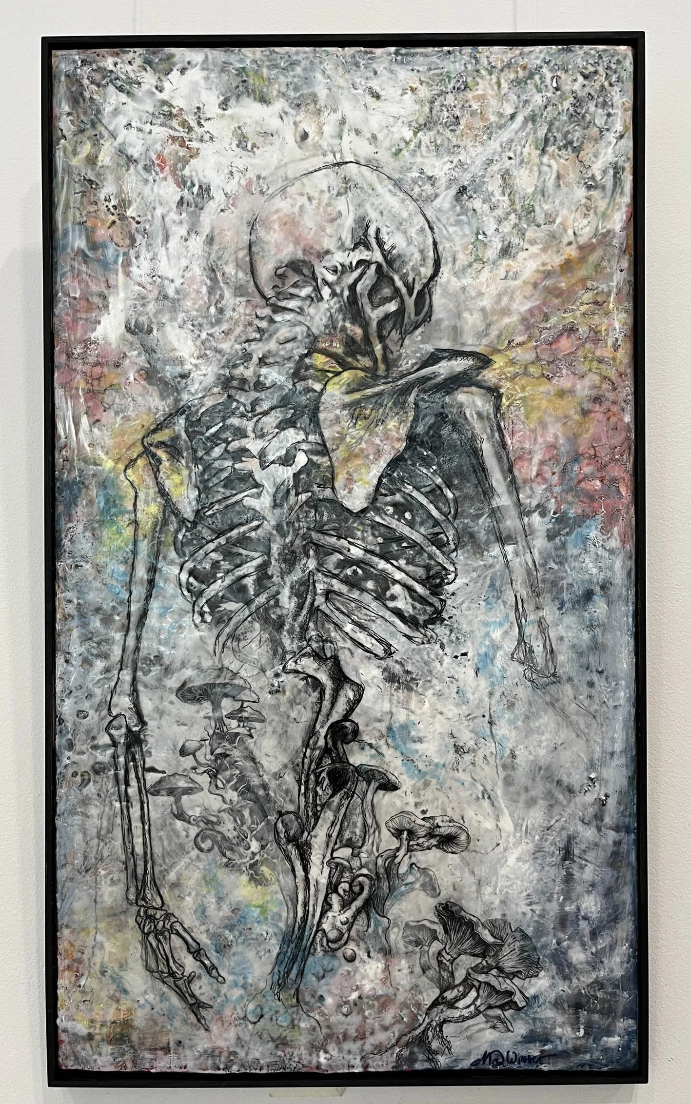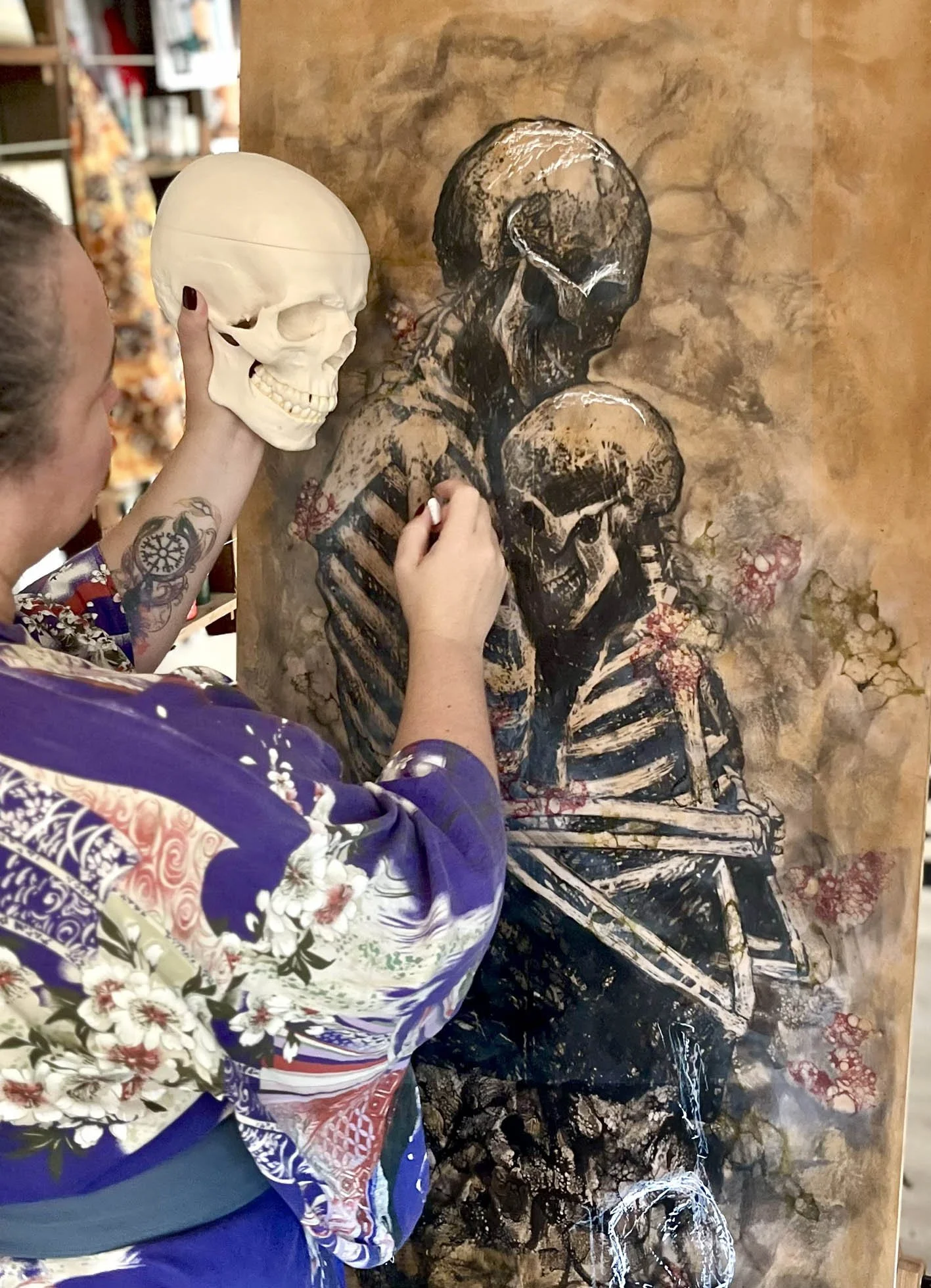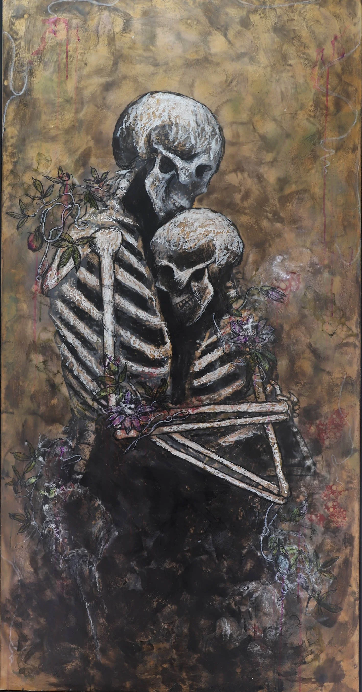Skelly is a poignant reminder of mortality and the passage of time. Yet, amidst this stark imagery, passion flowers bloom, symbolizing resilience, renewal, and the enduring power of love and memory. The delicate tendrils of the passion flowers intertwine with the bones, suggesting a fusion of life and death, growth and decay. Through this piece, I invite viewers to contemplate the cyclical nature of existence, finding solace in the beauty that emerges even in the most unexpected places