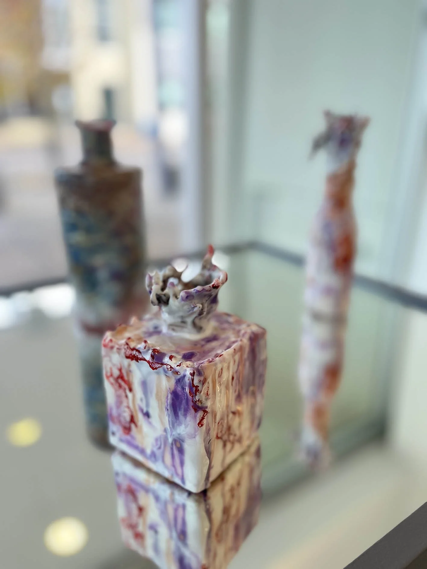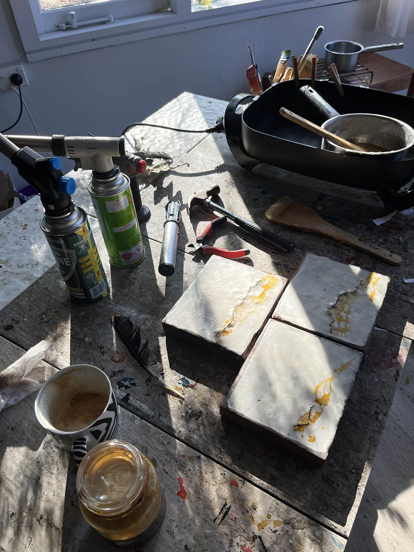 These started as an experiment to see if the Encaustic wax would stick to glass, turns out it does, brilliantly. Some of these bottles have additional bits of garden objects imbedded. The Wire vessels are a combination of paper Mache (recycled from unwanted documents in the office) covered in various colours of wax and burnt shellac.