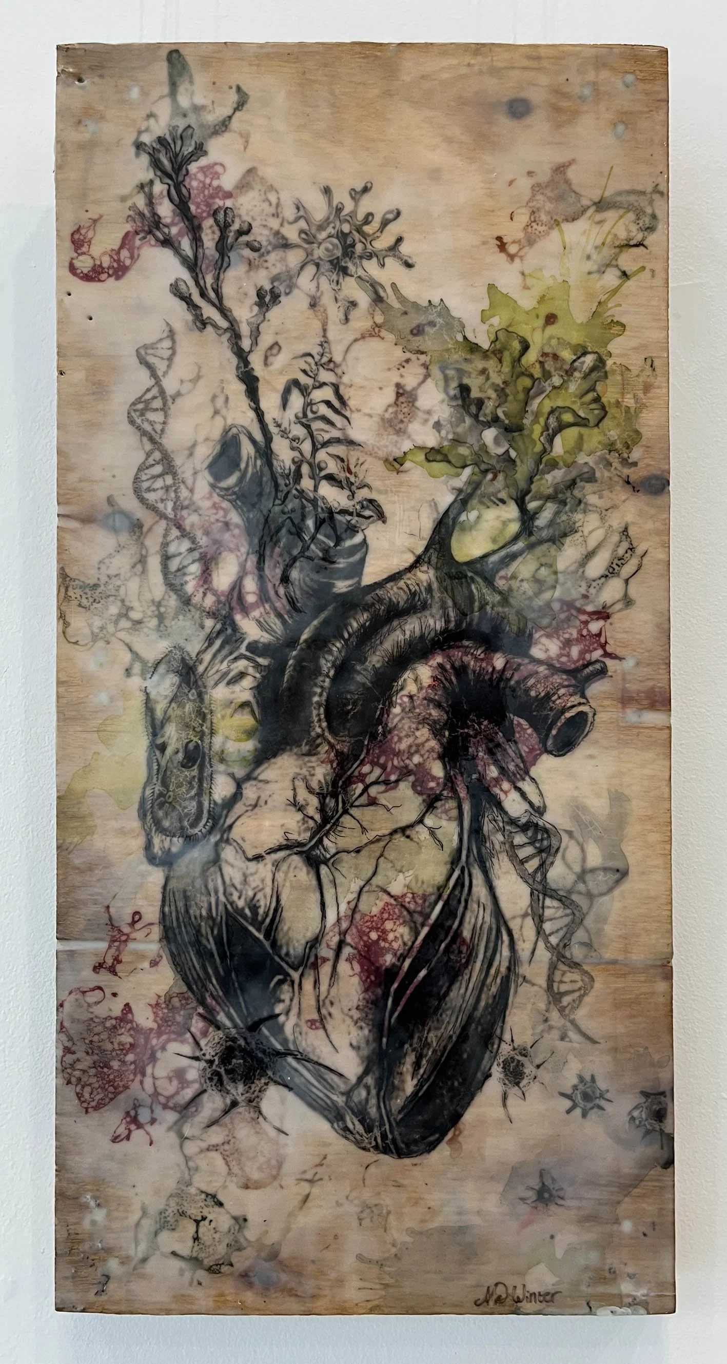 Plural Pleura explores the breath of life and the fragile spaces that hold it. Within the cross-section of a chest, lungs and heart open to reveal a tree and honeycomb growing from within, reminding us that breath and life are deeply connected to the living world around us. The honeycomb, built cell by cell, becomes a symbol of community and resilience, while the bees, tireless and essential, echo the pulse of the heart itself. As the lungs mirror the branching forest, so too does the hive reflect the interconnectedness needed to sustain life. This work invites us to consider the delicate balance between the human body and the natural world, and the role of even the smallest creatures in the breath we take each day