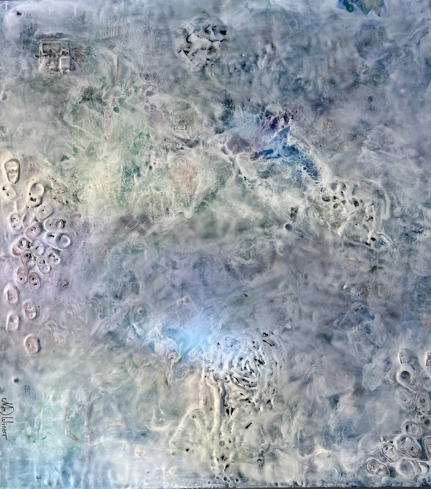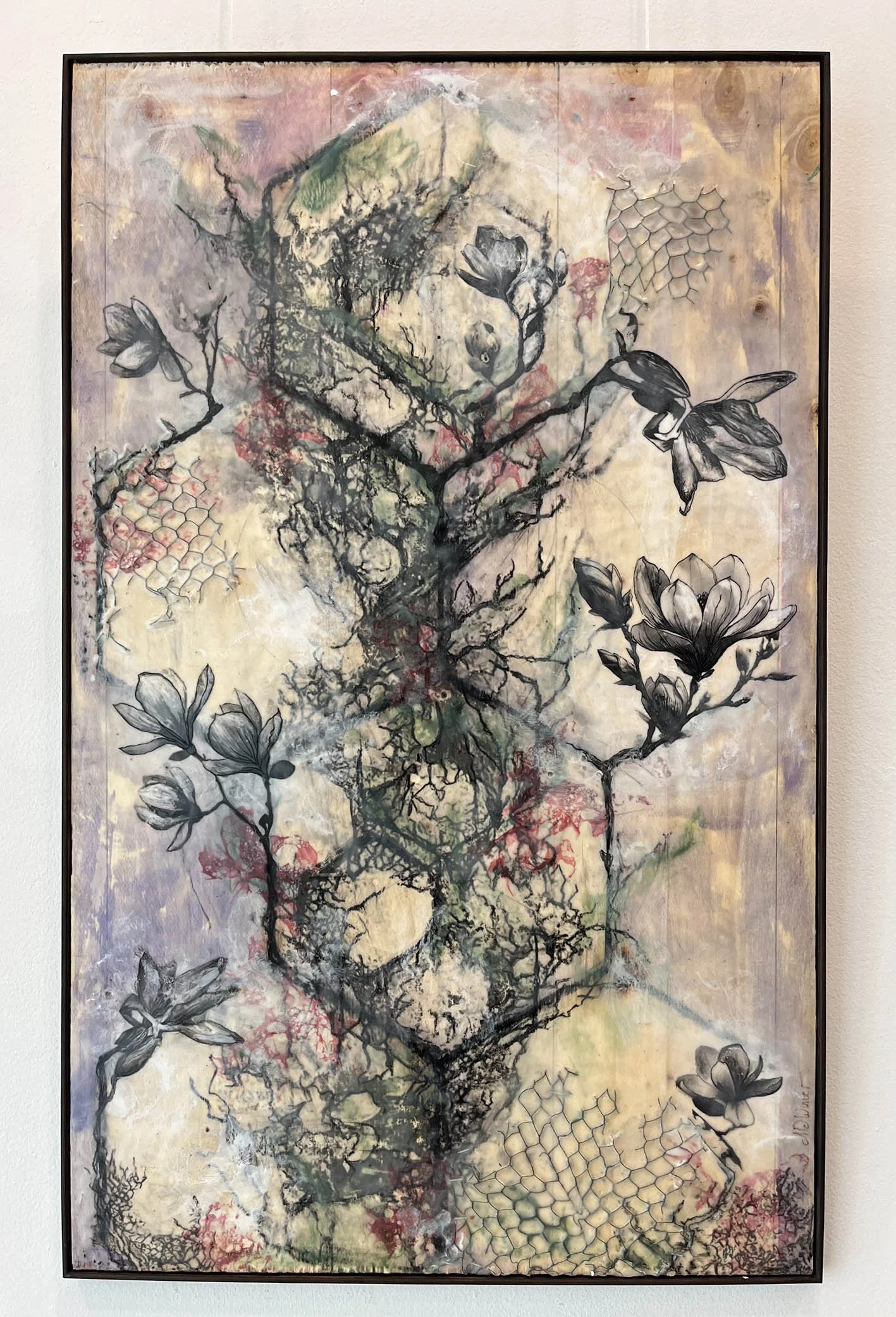 Magnolia Lattice features a hexagon pattern that pays homage to the hardworking bees who make the encaustic medium possible. The magnolia — a flower that transforms from serene, moonlike globes to dried, sculptural husks — embodies the beauty of change. This piece celebrates both the unseen Labor behind creation and the quiet elegance found in each stage of transformation.