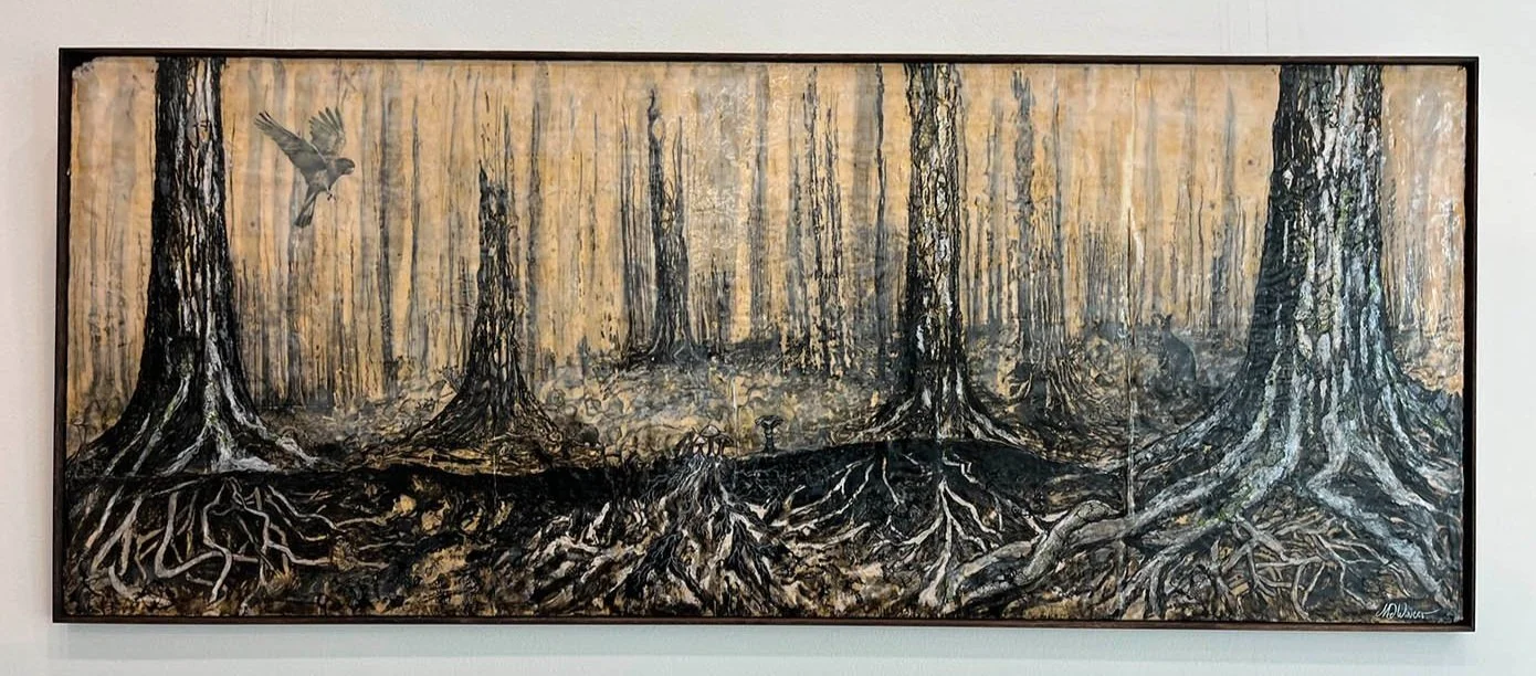 Beneath the forest floor lies a hidden conversation. The Network explores the unseen threads that connect life above and below the ground, from the silent reach of tree roots to the delicate lace of mycelium carrying messages and nourishment between beings. Above, trunks stand as sentinels; below, an intricate web of fungi, roots, and creatures reminds us that nothing truly exists in isolation. Each insect, worm, and tendril is part of a living tapestry, revealing the deep interdependence that sustains the forest and, by extension, us. This work invites you to look closer and consider the unseen networks holding our world together
