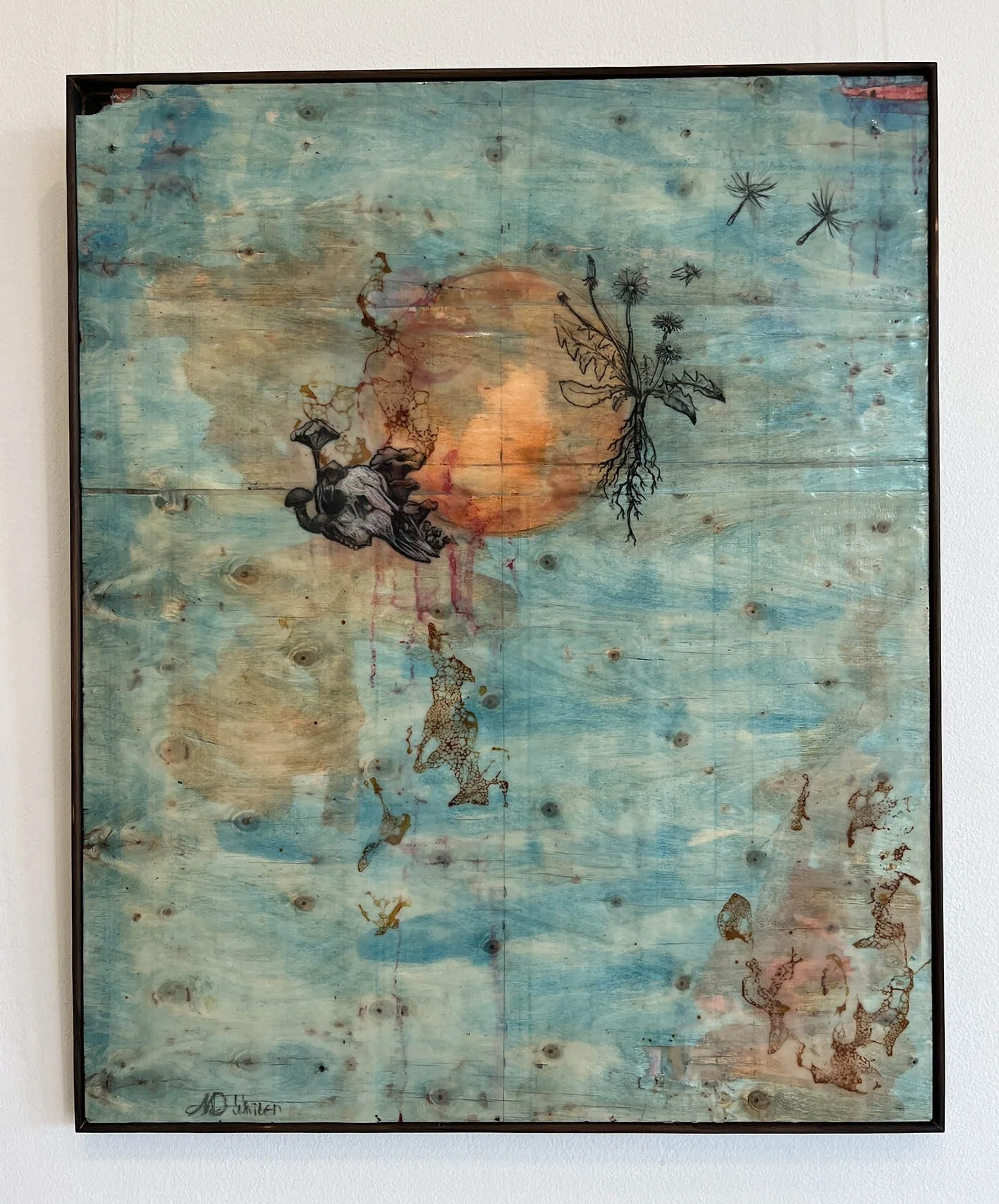 Encaustic and ink on recycled board