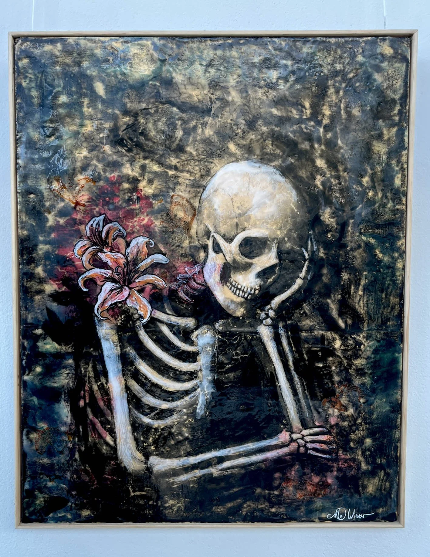 Ponder portrays a lone skeleton, appearing both contemplative and quietly lonely, with delicate lily flowers resting on its shoulder. The piece invites us to reflect on solitude, memory, and the fragility of existence — suggesting that even in our barest, most vulnerable states, there is room for tenderness and quiet beauty.